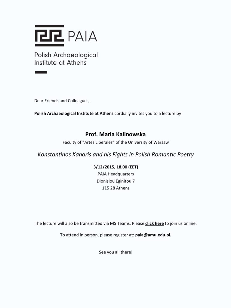 Szanowni Państwo,  Polski Instytut Archeologiczny w Atenach ma przyjemność zaprosić na wykład  Prof. dr hab. Marii KalinowskiejWydział „Artes Liberales” Uniwersytetu Warszawskiego Konstantinos Kanaris and his Fights in Polish Romantic Poetry 3/12/2015, 18.00 (EET)PIAA Główna siedzibaDionisiou Eginitou 7115 28 Ateny Wykład będzie transmitowany jak i w wersji zdalnej: link do spotkania. Jeśli chcą Państwo wziąć udział osobiście w wykładzie, […]