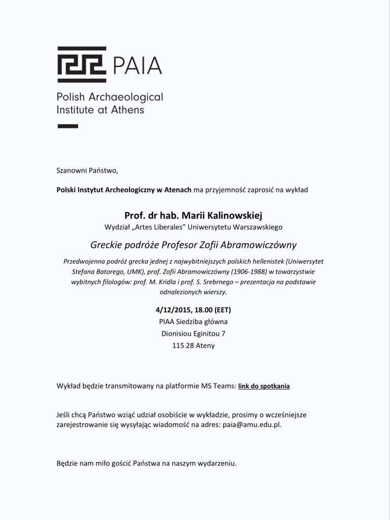Szanowni Państwo,  Polski Instytut Archeologiczny w Atenach ma przyjemność zaprosić na wykład  Prof. dr hab. Marii KalinowskiejWydział „Artes Liberales” Uniwersytetu Warszawskiego Greckie podróże Profesor Zofii AbramowiczównyPrzedwojenna podróż grecka jednej z najwybitniejszych polskich hellenistek (Uniwersytet Stefana Batorego, UMK), prof. Zofii Abramowiczówny (1906-1988) w towarzystwie wybitnych filologów: prof. M. Kridla i prof. S. Srebrnego – prezentacja na podstawie odnalezionych wierszy. […]